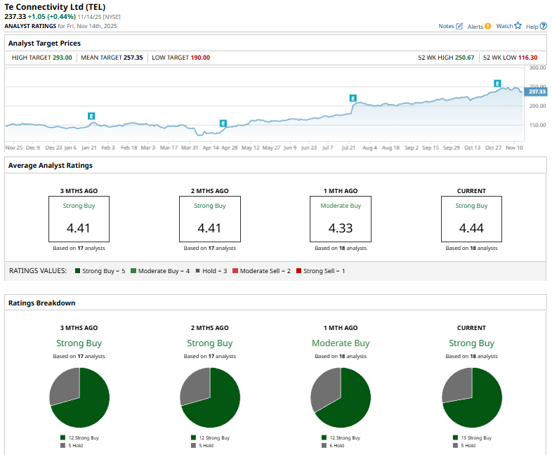 On Nov. 4, Barclays analyst Guy Hardwick reiterated his “Overweight” rating on TE Connectivity and raised the price target to $277 from $249, reflecting an 11.24% increase and signaling sustained confidence in the company’s outlook.