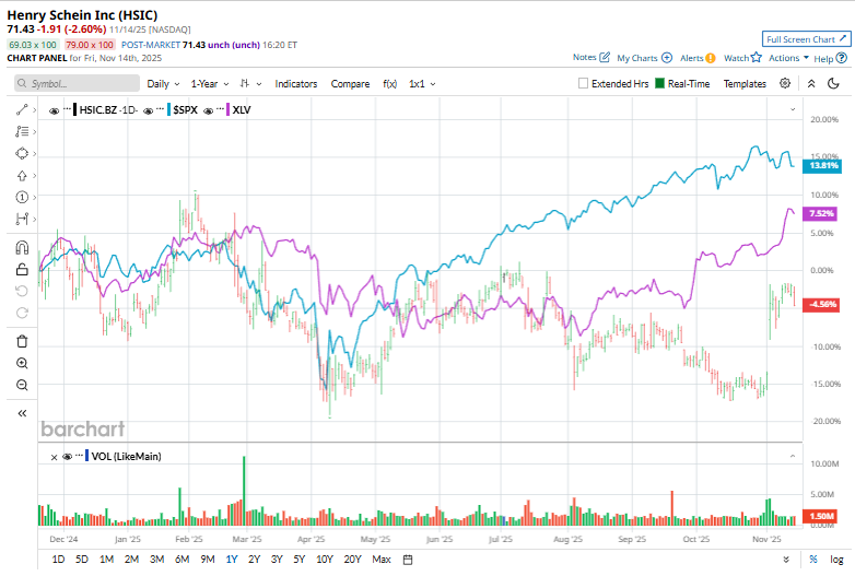 Looking closer, Henry Schein stock has outpaced the Health Care Select Sector SPDR Fund's (XLV) 5.1% drop over the past 52 weeks.